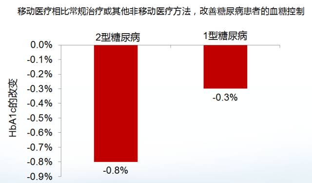 移动医疗提供了医患沟通联络的平台,在慢病管理中有助于症状评估、病情记录、远程会诊等,具有重要价值。 此外我国市场调研显示:在互联网慢病管理的投资占比中血糖管理占30%,是最受关注的慢病管理热点。同时多项研究表明,移动医疗相比常规治疗或其他非移动医疗方法,能够有效改善糖尿病患者的血糖控制。 移动医疗能够有效改善糖尿病患者的血糖控制