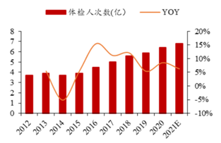 随着国内居民健康意识不断提高,体检人次数逐年上升,根据iiMedia Research,2020年国内体检人次约为6.4亿人次,预计2021年达到6.8亿人次,同比增长为6.3%。